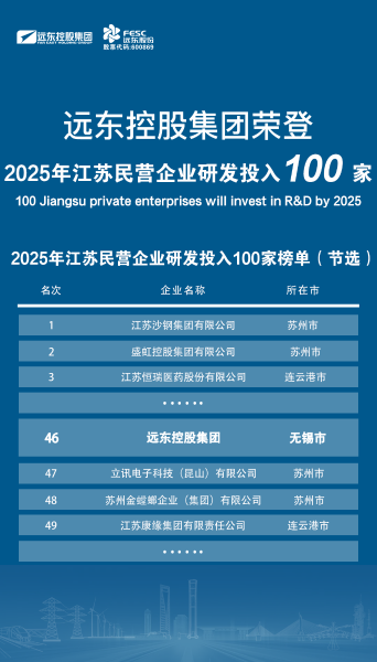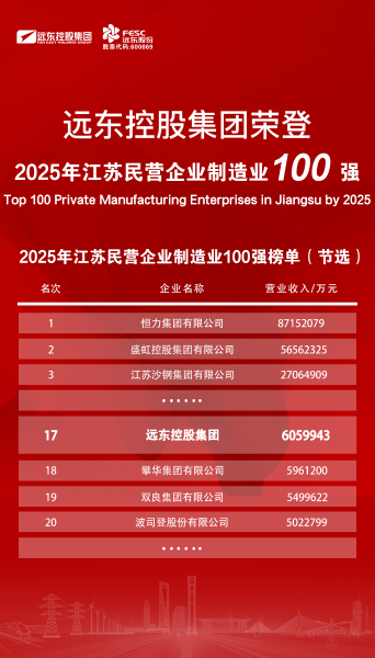 10月12日,2025江蘇民營(yíng)企業(yè)百?gòu)?qiáng)發(fā)布活動(dòng)在徐州舉行。省委常委、省委統(tǒng)戰(zhàn)部部長(zhǎng)胡廣杰出席活動(dòng)并講話,省委統(tǒng)戰(zhàn)部副部長(zhǎng)、省工商聯(lián)黨組書記劉軍主持活動(dòng)。省發(fā)改委、省科技廳、省工信廳,省工商聯(lián)有關(guān)領(lǐng)導(dǎo),及各設(shè)區(qū)市工商聯(lián)負(fù)責(zé)領(lǐng)導(dǎo),百?gòu)?qiáng)民營(yíng)企業(yè)代表等參加活動(dòng)。會(huì)上,省工商聯(lián)主席劉聰發(fā)布江蘇民營(yíng)企業(yè)百?gòu)?qiáng)系列榜單,遠(yuǎn)東分別榮登2025江蘇民營(yíng)企業(yè)200強(qiáng)第22位、2025江蘇民營(yíng)制造業(yè)100強(qiáng)第17位以及2025江蘇民營(yíng)企業(yè)研發(fā)投入100家第46位!